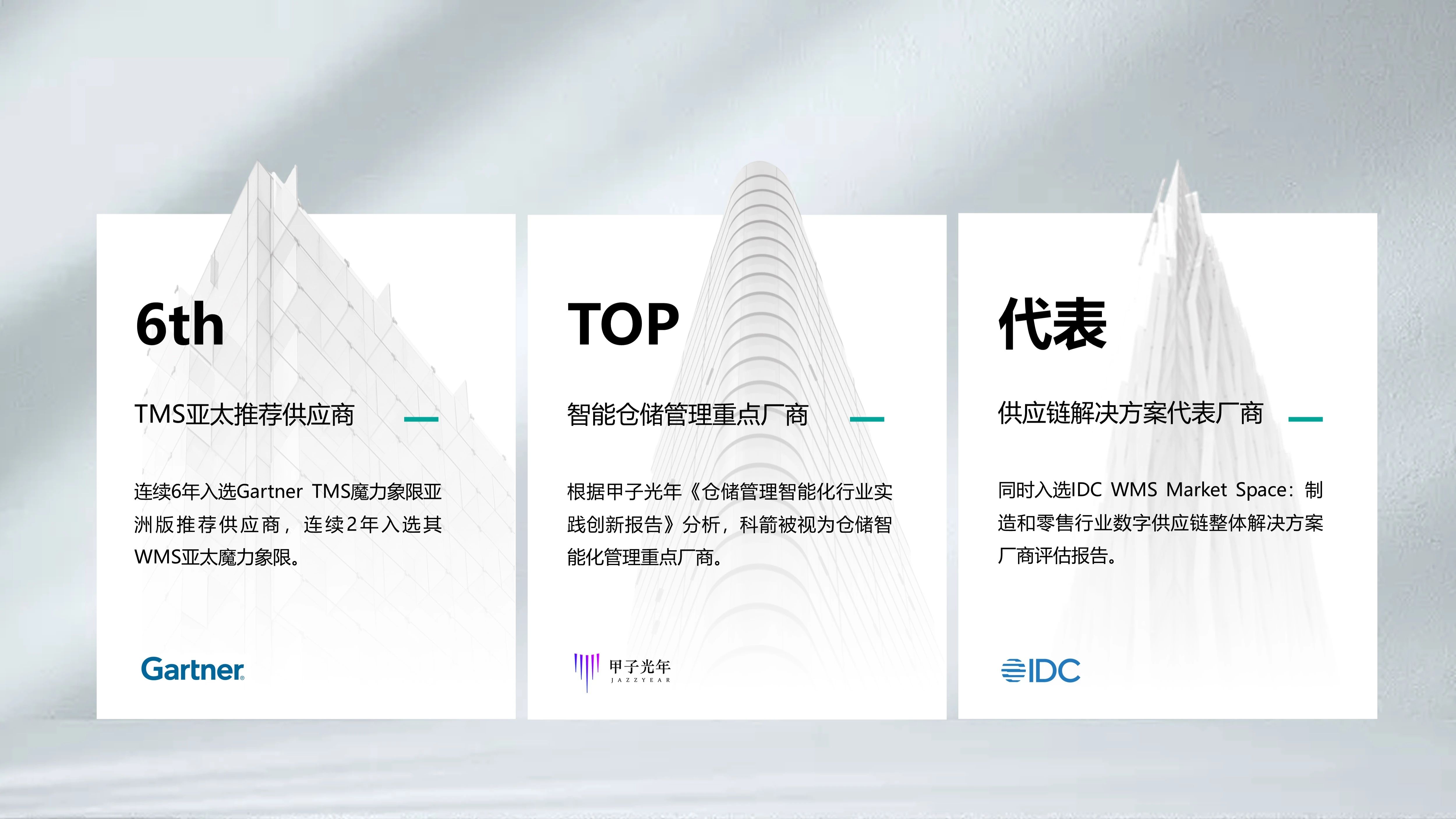 很榮幸,我們的產(chǎn)品服務(wù)作為典型被多份重磅行業(yè)報告收錄和推薦,其中已連續(xù)6年入選Gartner TMS/WMS魔力象限亞太版。除此之外,更憑借創(chuàng)新物流技術(shù)走向應(yīng)用落地和商業(yè)化的成功案例獲得了媒體的諸多認(rèn)可。