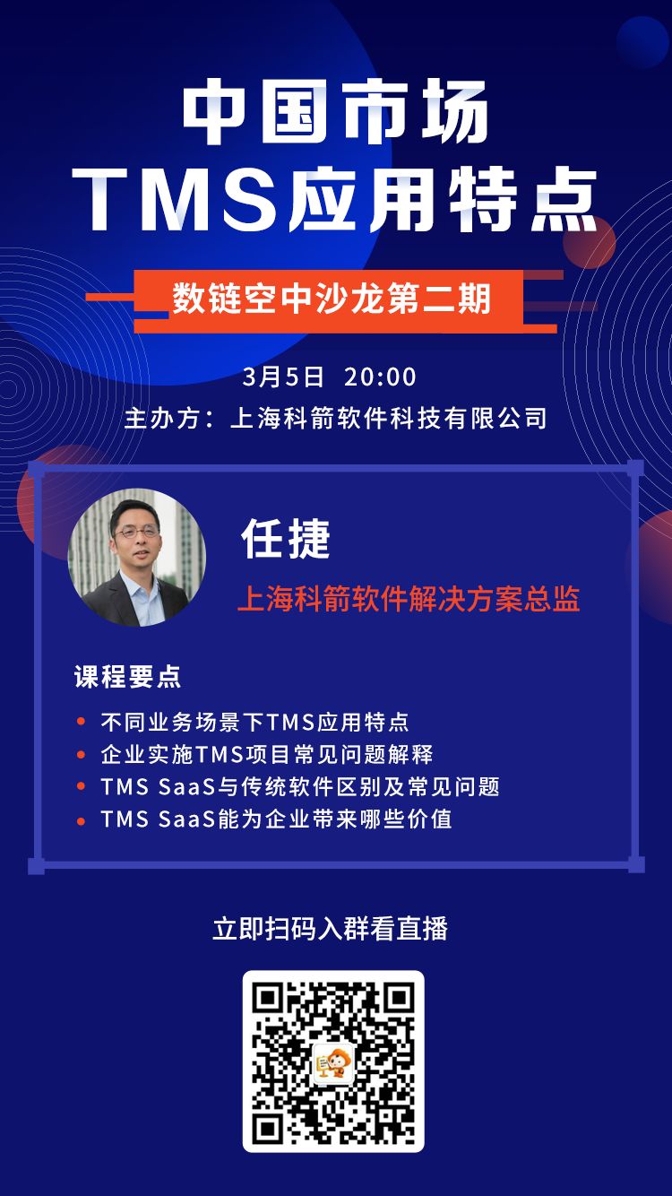 今晚20點(diǎn)整,科箭供應(yīng)鏈解決方案總監(jiān)任捷先生將在線為大家詳細(xì)介紹科箭TMS云的應(yīng)用特點(diǎn)及項(xiàng)目價(jià)值,歡迎掃碼入群看直播。