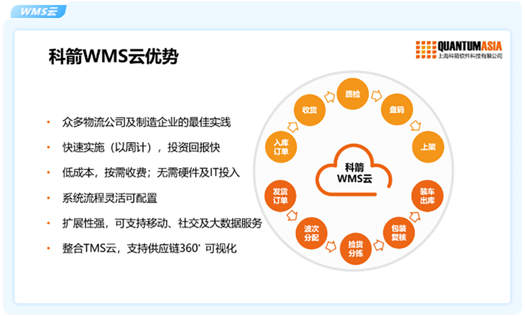科箭在供應(yīng)鏈領(lǐng)域擁有十多年的經(jīng)驗(yàn),是國(guó)內(nèi)最早轉(zhuǎn)型云端的供應(yīng)鏈軟件公司。WMS云是基于行業(yè)沉淀設(shè)計(jì)的專業(yè)SaaS倉(cāng)儲(chǔ)管理產(chǎn)品。針對(duì)制造、零售、物流及電商等行業(yè),WMS云流程可配置,場(chǎng)景化設(shè)計(jì),可快速上線,投資回報(bào)快。