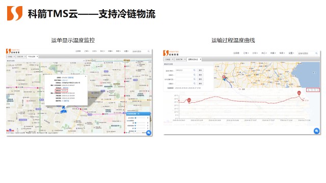 冷鏈在于能控制易腐產品溫度,確保其使用的安全性,保證消費者在購買時產品仍具有良好的品質。冷鏈的每一個環節都需要參與控制,任何一個環節出錯而使冷鏈斷裂,或是在倉庫的月臺上,或在運輸途中,或在儲存過程中,或是在零售超市里,都很容易產生問題。科箭TMS云通過與溫控儀集成,運單搭載了溫控設備,在可視化運單上可以監控溫度;查詢運單對應的發貨訂單貨運軌跡時可以顯示溫度曲線 ,讓貨主、運輸方、客戶實時了解貨品狀況。