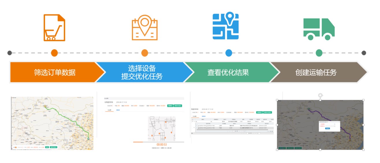 科箭TMS云集成阿里云優化引擎后,只需以上四步即可完成運輸訂單分配與優化,完成運輸任務創建,幫助客戶: