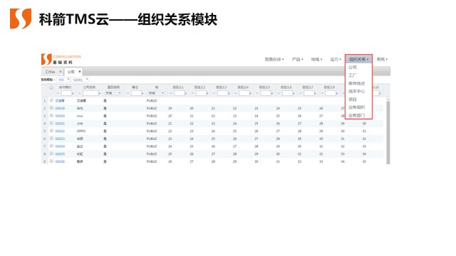 大型的集團企業客戶,除了復雜的公司層級與組織結構外,需要實現多維度的業務分析與成本控制模型的標準化,對運費的管理與分攤有非常細致的規則要求。科箭TMS云為滿足眾多大型客戶的需求,在基礎資料中增加了組織關系模塊,涵蓋公司、工廠、庫存地、成本中心、項目、業務組織、業務部分,并完善了組織關系下這些子模塊的功能,滿足企業多組度的管理控制與業務分析要求。