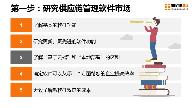 研究階段是軟件選型過程中較有意思的步驟之一。 您可以上網、通過社交網絡或下載白皮書來熟悉了解供應鏈管理軟件市場的現狀。 如果您已經了解了有關供應鏈管理軟件的一些信息,請使用此步驟來了解這些軟件的最新動態。 如果從沒了解過這個行業,也不要擔心自己不夠專業,盡量搜尋些您將要進行評估的軟件的背景資料。 您需要了解這些系統的功能,各種部署模式(例如,基于云端的還是本地部署的)以及學習行業術語。 了解一下通過這些軟件能在哪些方面改善物流運營也很重要。 您正在進行一個全新的投資,因此利用好這個機會重新設計流程并實現飛躍式提升,從而大幅提升效率。 最后,大致了解這些系統的成本。
