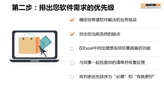 現在是時候專注于辨別和確認軟件需求的優先級,也就是您想從新軟件中獲得哪些關鍵功能。 這一關鍵的研究過程是軟件選型的基礎。 通過了解您的需求,您將能夠更好地控制選型過程,而不是讓軟件供應商左右您的需求。先確定您想要解決哪些業務挑戰以及您當前的系統無法為您實現的功能。然后創建一個Excel電子表格,列出解決這些挑戰和缺陷所需的所有軟件功能。 讓您的同事也參與其中。 最后,當您的詳盡列表完成后,您需要將其優先級劃分為“必要”功能以及那些“有就更好”的功能。