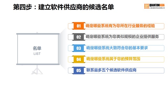 構建供應鏈管理軟件供應商的候選名單是軟件選型中更具挑戰性的步驟之一。 對超過五種產品進行深度評估是不可行的,因此將范圍縮小到五個或更少是至關重要的一步。 問題是市場上有數百個供應鏈管理軟件系統,而其中只有一小部分適合您。 第4步可能需要數周的工作。 但是,您可以使用一些非常簡單的標準來縮小您的候選名單。 從一長串產品名單開始,然后去掉不適合您所在行業、不適合您企業規模或主要功能要求不符合的系統。 接下來,了解粗略定價范圍以排除遠超預算的系統。 一旦你有一個簡短的清單,你就可以與供應商溝通了。