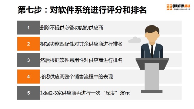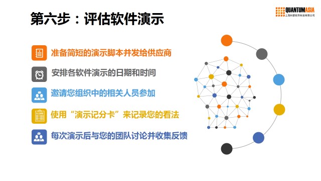 觀看軟件演示可能是軟件選擇流程中最關鍵的一步。 在這里,您可以看到系統的運行情況,并了解它們真正可以為您做些什么。 您當然可以進行多次演示,但這可能是您可以非常詳細地查看系統的唯一機會。 為了充分利用演示,您應該為每個供應商提供一些“演示腳本”,詳細說明您希望在演示中看到的常見業務流程。 您提供的詳細信息越多,您對演示過程的控制就越好。 請務必為每個演示安排特定的日期和時間,并邀請組織中的相關人員參加。 在演示過程中,使用“演示評估卡”記錄您的觀點,事后與同事一起討論比較。