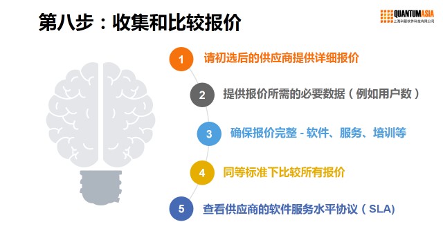 現在是時候從剩下的幾家軟件供應商處獲取詳細報價了。 雖然我們認為價格不應該是您的主要決策標準,但它可能是一個重要的決定因素。 此外,讓兩到三家供應商競爭您的業務可能會帶來更具競爭力的價格調整。 要求每個供應商提供詳細的報價,包括與系統相關的所有成本。 這包括軟件許可、客戶化、支持與維護其他費用。 還要求他們指定運行系統所需的任何第三方硬件或網絡設備。要知道現在有許多定價模型(例如,軟件許可證、每月每年訂閱費),因此您需要“標準化”報價以進行同等比較。