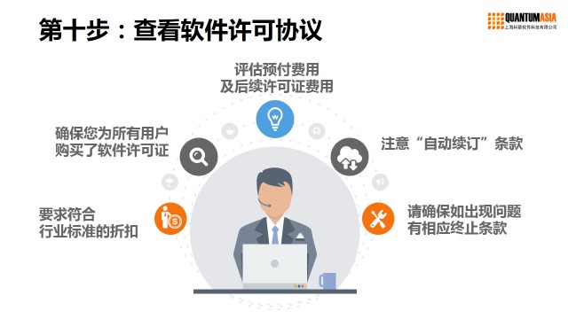 最后一步,你準備買了,但在您付款之前,您需要查看軟件許可協議。 一般來說,軟件公司可提供的折扣根據交易規模而增加(例如,更大的交易=更大的折扣)。 當然,有一些供應商不打折,他們對所有客戶收取一個標準價格。 無論如何,都可以試著要求折扣。 交易的條款和條件同樣重要。 確保您為整個組織購買足夠的許可證,請注意自動續費條款,并確保如果供應商沒有達成承諾時您可以有一些追索權。