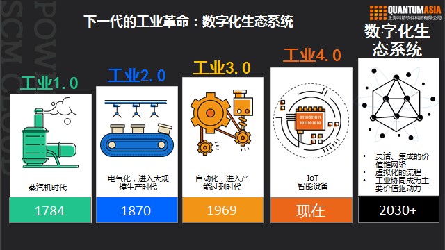現(xiàn)今工業(yè)的模式已經(jīng)和最初完全不同了,經(jīng)過一系列的變遷,由最早的工業(yè)1.0進(jìn)化到了如今基于工業(yè)互聯(lián)網(wǎng)、人工智能的工業(yè)4.0時代,而其中供應(yīng)鏈環(huán)節(jié)也成為了高度信息化過程中必不可少的一部分,甚至可以說是核心。下一代的工業(yè)革命,將是數(shù)字化驅(qū)動的、通過構(gòu)建生態(tài)系統(tǒng)打造靈活、集成的價值鏈網(wǎng)絡(luò)。在數(shù)字化生態(tài)系統(tǒng)下,工業(yè)協(xié)同成為主要價值驅(qū)動力。