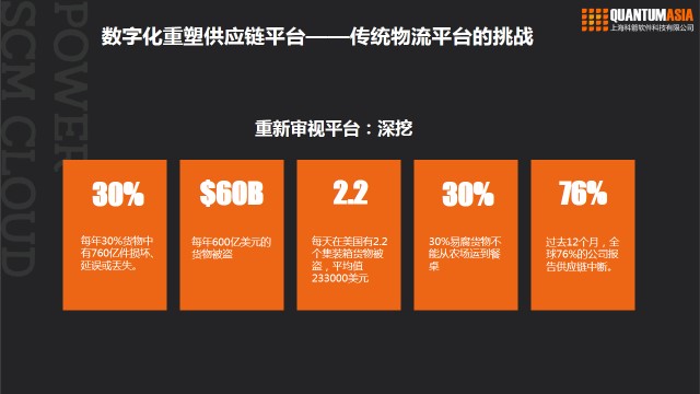 傳統(tǒng)物流運(yùn)營效率低下,在轉(zhuǎn)型過程中面臨著巨大挑戰(zhàn)。據(jù)統(tǒng)計,每年有600億美元的貨物被盜,30%的貨物損毀,30%的易腐貨物不能從農(nóng)場運(yùn)到餐桌,76%的公司報告過供應(yīng)鏈中斷。凱捷的調(diào)研報告指出,65%的企業(yè)已經(jīng)開始了供應(yīng)鏈的數(shù)字化轉(zhuǎn)型。如果您是家三方物流公司,所服務(wù)客戶的供應(yīng)鏈模式已經(jīng)發(fā)生改變,那自身公司的信息化程度、專業(yè)性能不能去滿足到客戶的變化就成為了首要問題。要解決這些問題,凱捷提到首先數(shù)字化重塑供應(yīng)鏈結(jié)構(gòu)需要平臺化,其次需要有一個使用數(shù)據(jù)的能力,一般我們稱之為大數(shù)據(jù),第三個是云計算能力。