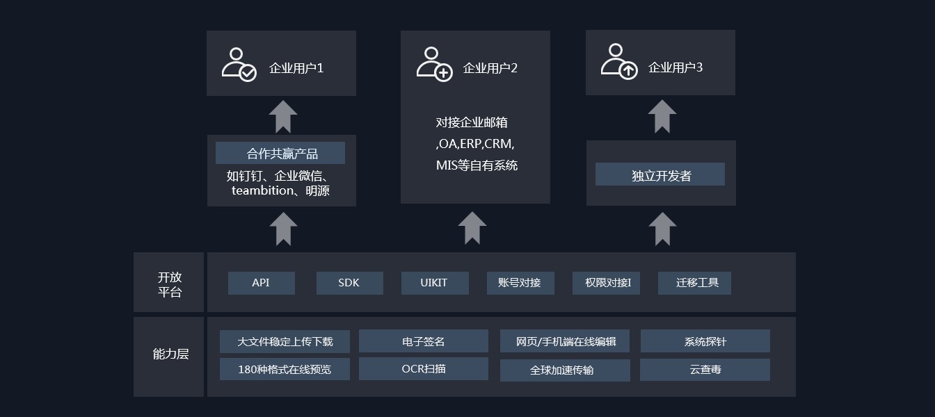 除了上述產(chǎn)品自身的眾多創(chuàng)新成果外,億方云還與眾多第三方應(yīng)用進(jìn)行集成,通過API、賬號(hào)對(duì)接、權(quán)限對(duì)接等融入辦公生態(tài),融合了包括一起寫的在線編輯能力、Teambition的文件協(xié)作能力、綠盟的平臺(tái)加固等安全能力及浩辰軟件在建筑行業(yè)的特殊格式文件預(yù)覽能力等,為自身產(chǎn)品整體賦能。