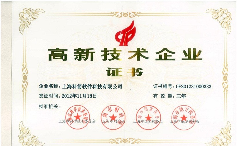 科箭軟件再次榮獲上海市“高新技術企業”認定