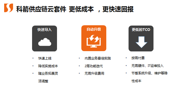 與傳統的供應鏈系統相比,科箭的一體化供應鏈云平臺具有快速實施、快速回報、場景化設計、可靈活配置、消費級用戶體驗等特點和優勢。