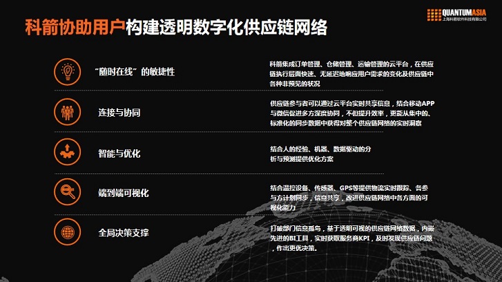 科箭為汽車行業客戶構建的透明數字化供應鏈網絡,具有隨時在線、連接與協同、智能與優化、端到端可視化、全局決策支持等特征。