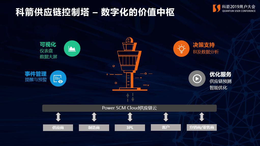 供應(yīng)鏈控制塔(SCCT)在恰當(dāng)?shù)臅r(shí)間把需要的信息呈現(xiàn)給相關(guān)人員,成為企業(yè)各業(yè)務(wù)部門(mén)信息的匯集平臺(tái),實(shí)現(xiàn)實(shí)時(shí)事件與例外管理,全流程透明可視化,為管理者提供決策支持,通過(guò)缺預(yù)測(cè)性分析、AI算法等不斷優(yōu)化供應(yīng)鏈業(yè)務(wù)。