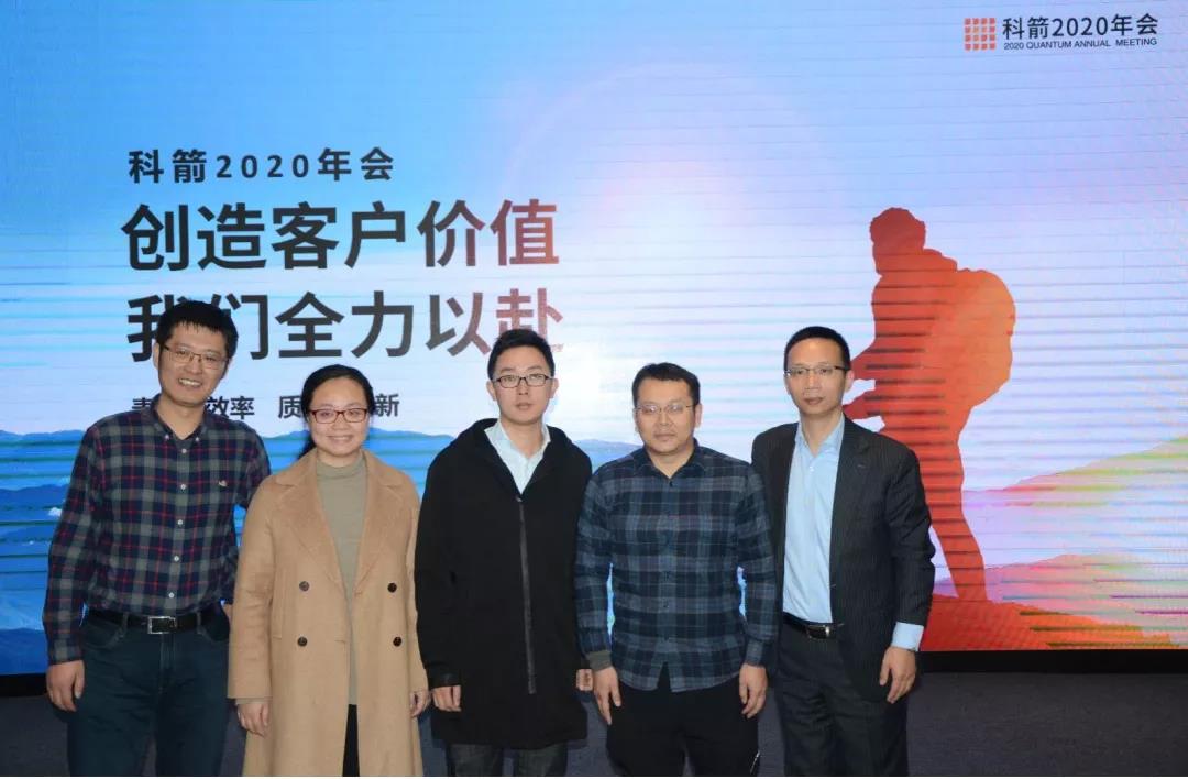 科箭2020年會上,科箭董事長劉斌先生(右一)與秦虎教授的團隊成員合影